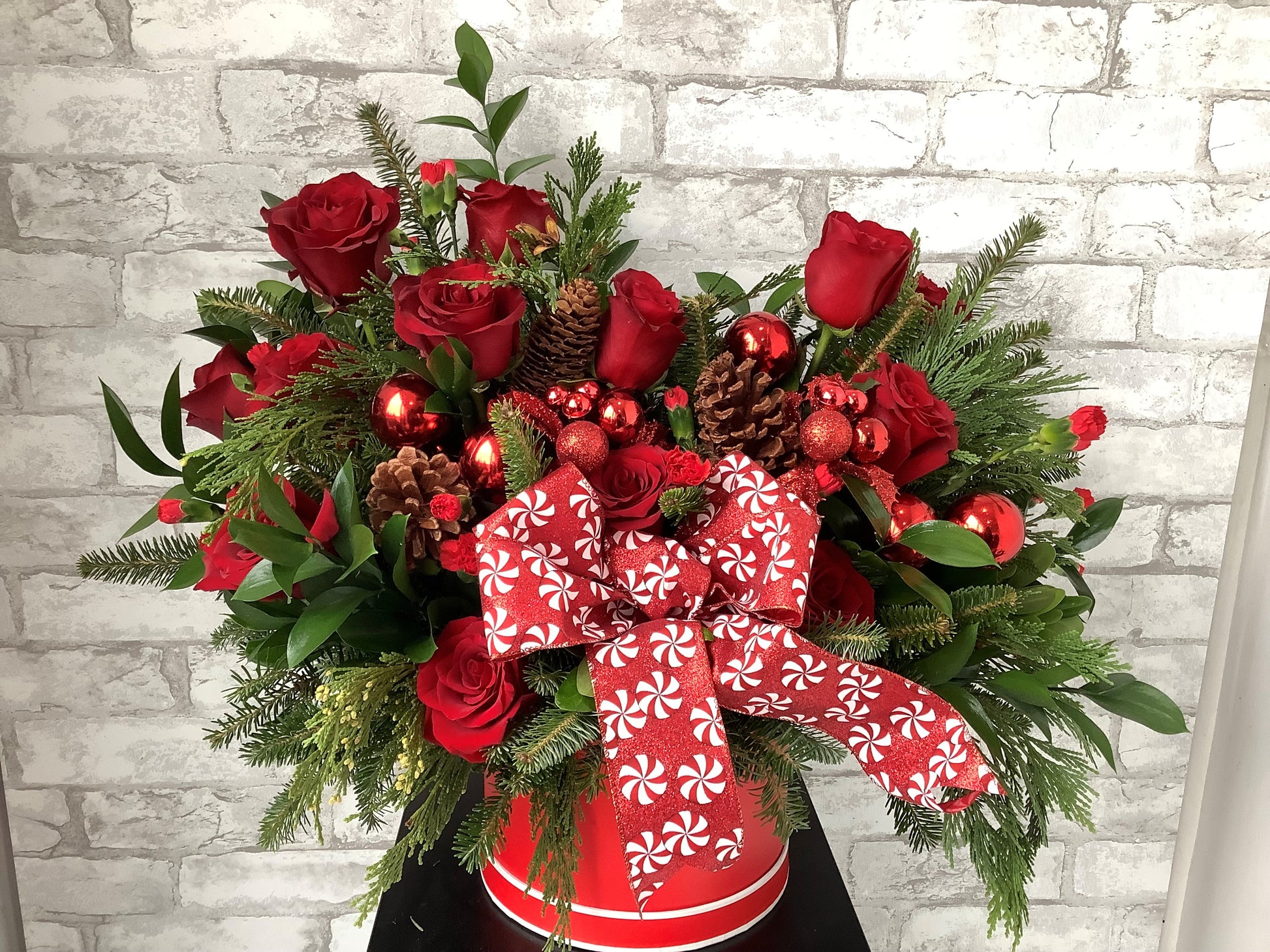 Celebrate the season with our "All Wrapped Up" Christmas flower box arrangement. This expertly curated design combines festive florals in rich reds, elegant whites, and lush greens, perfectly complemented by luxurious wrapping and seasonal accents. Each arrangement is thoughtfully composed to bring warmth and holiday cheer to any space. Ideal for gifting or creating a stunning centerpiece, this arrangement captures the spirit of Christmas with sophisticated style and fresh, premium blooms that will brighten your home throughout the festive season.