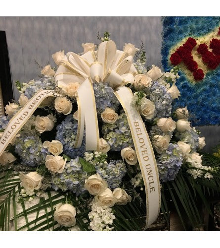 The "Casket Cover 13" from Dragonetti Florist is an exquisite casket spray that offers a serene and dignified tribute to a beloved family member. This arrangement gracefully combines the delicate beauty of white roses and soft baby's breath with the tranquil hues of blue hydrangeas, creating a soothing palette that symbolizes peace and remembrance.