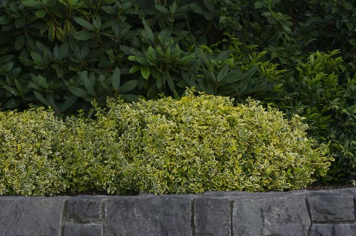 This colorful evergreen shrub sports bright green leaves with gold edges, turning pinkish red in fall and winter. Spreads by creeping stems that root where they touch the ground. Dense mounding form makes an excellent small hedge or border plant. Gently climbs with support, making a nice background or foundation planting.