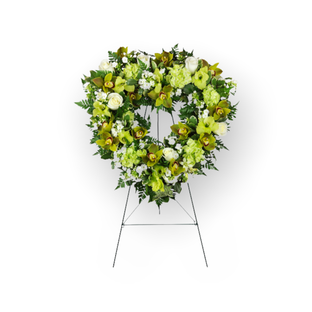 As unique as the life it celebrates, this lovely standing funeral spray is timeless yet modern and delivers your condolences with simple grace. Shaped in the universal symbol of love, the heart, this spray features green cymbidium orchids, gladiolus, hydrangea and white dendrobium orchids. Your good taste and esteem for the dearly departed will comfort family and friends when you deliver your sympathies with this sweet funerary gift.