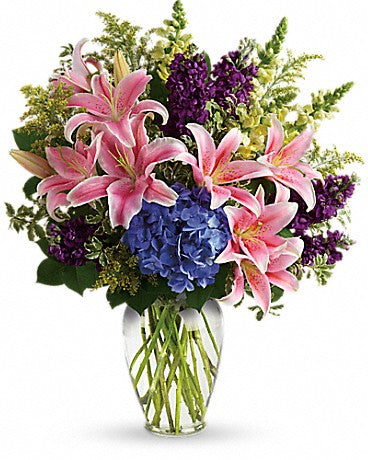 Put your words of caring into flowers with this beautiful array of pink lilies, blue hydrangea and other floral favorites